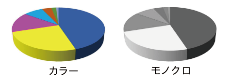 カラーデータをモノクロで印刷することはもちろん可能ですが、カラーデータをモノクロで印刷すると、 色の差異が少なくなり、色がどこで切り替わっているかがわかりにくくなります。 そのため、色の切り替えで表現している箇所については判別ができなくなる、その他にも文字が見えづらくなるようなこともあります。 上記の図のようなグラフ等では同じ色をはっきりとした濃淡(黒:グレー:白等)や、模様(斜線:網点:ベタ等)で使い分けたり、 文字については太字や下線等を用いて強調したり、モノクロで印刷した際に見えにくくならないように注意してデータ作成する必要があります。
