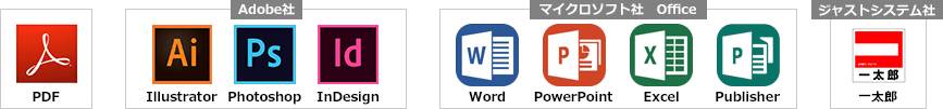 当サイトでは上記アプリケーション(データ形式)で作成された入稿データに対応しています。 PDF・Illustrator・Photoshop形式での入稿が比較的多くみられます。