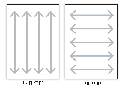 紙は大きなロール状に巻き取られながら製造され、この際に紙が流れる方向を紙目といいます。 断裁された印刷用の紙目は、紙の長辺に対し水平に紙目があるものを「タテ目(T目)」、紙目が垂直にあるものを「ヨコ目(Y目)」と呼びます。 製品として仕上げた際にも紙目によって丸まり具合や、冊子であれば開きやすさも変わってきます。 最終的な仕上がりに合わせて適切な紙目で印刷する必要があります。